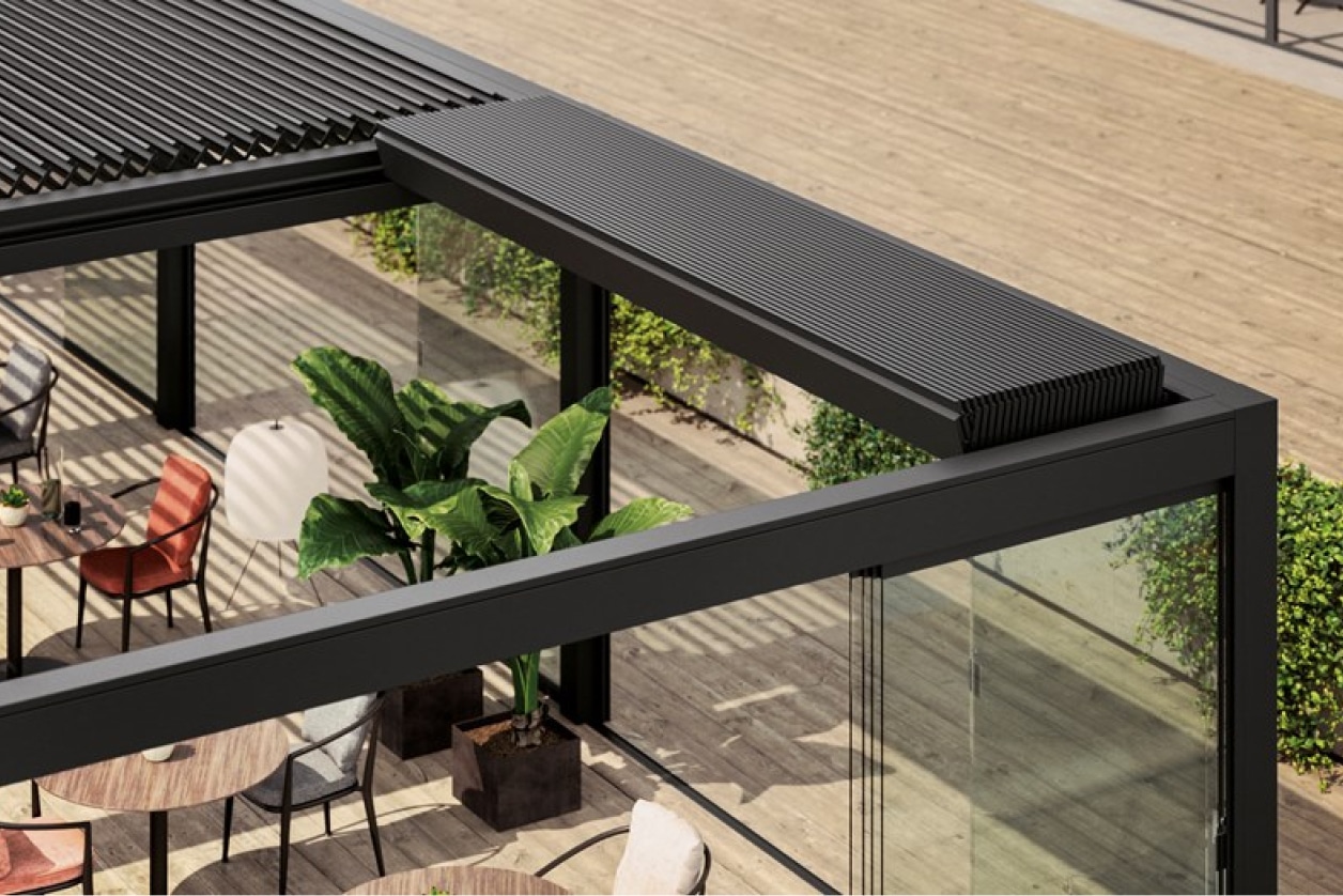 Bioclimatic coverings have a streamlined design combined with specific technological choices of the highest quality, for simple and rationalised daily use. Made of aluminium, stainless steel and of high-quality, certified materials to guarantee durability. Discover all the options for customising your structure.